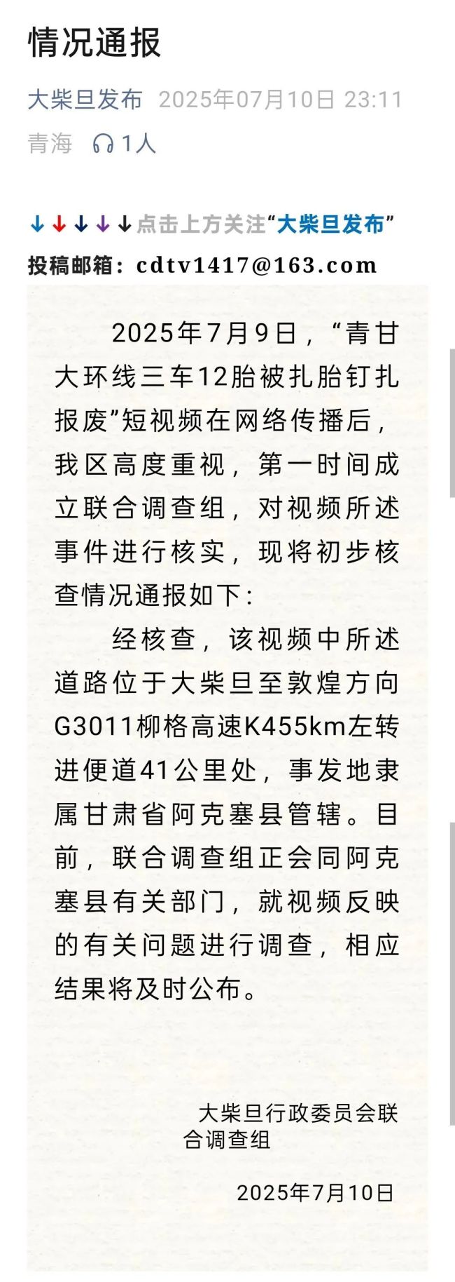 针对网络上流传的“青甘大环线三车12胎被扎胎钉扎报废”的短视频,青海省海西蒙古族藏族自治州大柴旦行政委员会联合调查组于7月10日晚发布了情况通报,指出事发地点位于甘肃省阿克塞县,并不在青海境内。