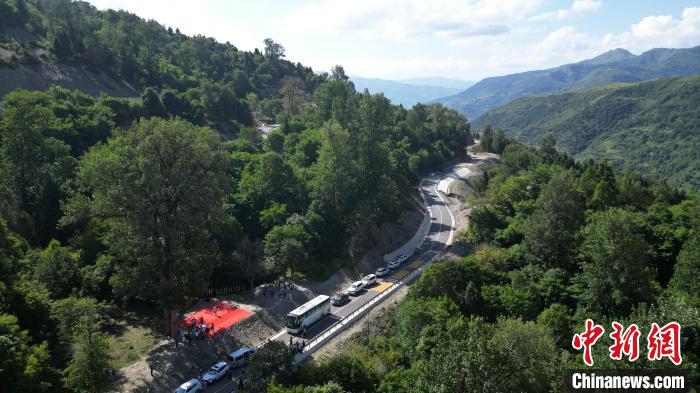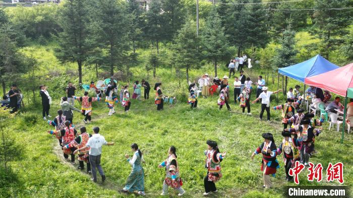 图为7月13日,藏族民众在“簪花之路”途经的沙滩国家森林公园跳锅庄舞。(无人机照片)九美旦增 摄