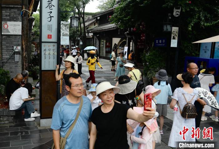 7月15日,四川成都,游人在宽巷子拍照。时下正值暑期旅游旺季,成都市宽窄巷子景区迎来众多游客前来游玩、打卡。中新社记者 王磊 摄