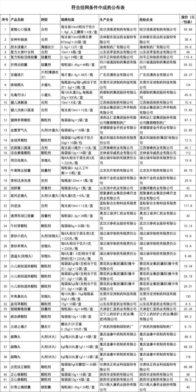 附:河北符合挂网条件中成药公布表(部分)