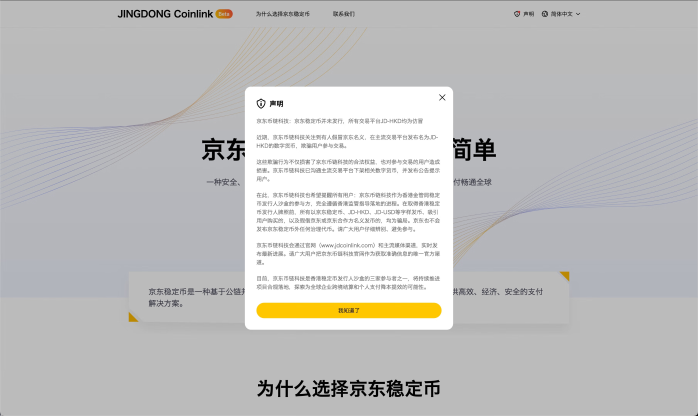 在此,京东币链科技也希望提醒所有用户:京东币链科技作为香港金管局稳定币发行人沙盒的参与方,完全遵循香港监管指导落地的进程。在取得香港稳定币发行人牌照前,所有以京东稳定币、JD-HKD、JD-USD等字样发币、吸引用户购买的,以及假借京东或京东合作方名义发币的,均为骗局。京东也不会发布京东稳定币外任何治理代币。请广大用户仔细辨别、避免参与。