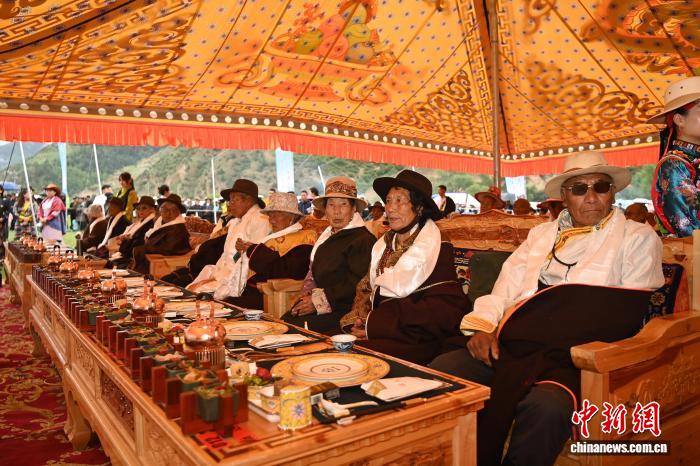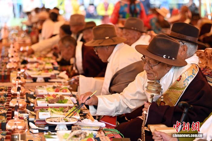 图为当地长寿老人品尝“藏王宴”。中新社记者 九美旦增 摄