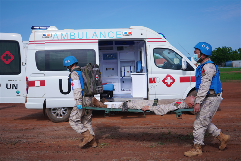 中国赴南苏丹(瓦乌)维和工兵分队与联南苏团多部门联合开展伤员救治演练
