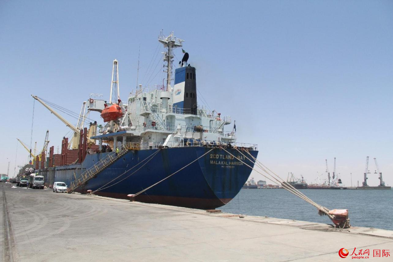 中毛友谊港入口,镌刻着中、阿、法三国文字的“友谊港”石碑镶嵌在白墙内。码头上,来自世界各地的散装货轮和集装箱船停靠在不同泊位,有序进行装卸。