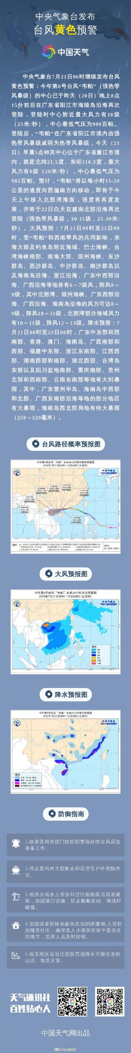 中央气象台7月21日06时继续发布台风黄色预警,今年第6号台风“韦帕”(强热带风暴级)的中心已于7月20日晚上8点15分前后在广东省阳江市海陵岛沿海再次登陆。登陆时中心附近最大风力达到10级(25米/秒),中心最低气压为980百帕。