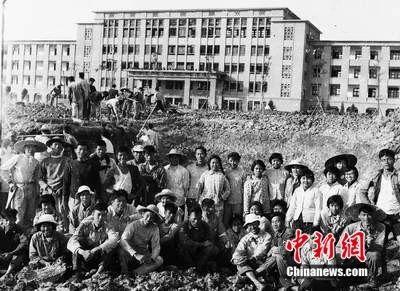 上个世纪六十年代,暨南大学同学在修建教学楼前的校道上合影。
