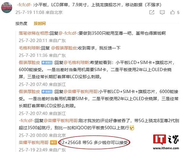 从评论区的讨论来看,荣耀小平板将提供12GB+256GB规格,并且会有5G通信版本。目前荣耀官方尚未公布更多详细信息。