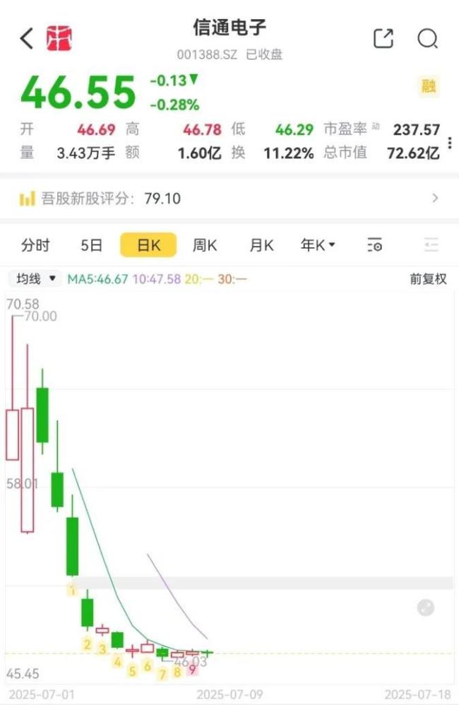 上市首日,股价一度站上70元/股,但上市即巅峰,此后数日连跌,截至7月18日收盘已跌至46.55元/股。