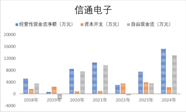 因此,从现金流的角度来说,信通电子的压力并不算大,2018年至2024年,公司依靠经营活动累计赚得现金超5亿元,比同期利润总额少了1.8亿元。