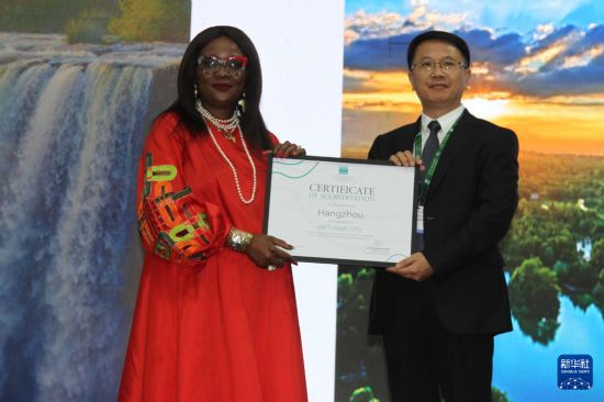 7月24日,在津巴布韦维多利亚瀑布城开幕的《湿地公约》第十五届缔约方大会上,《湿地公约》秘书长穆松达·蒙巴为中国浙江杭州代表颁发“国际湿地城市”证书。新华社发(塔法拉摄)