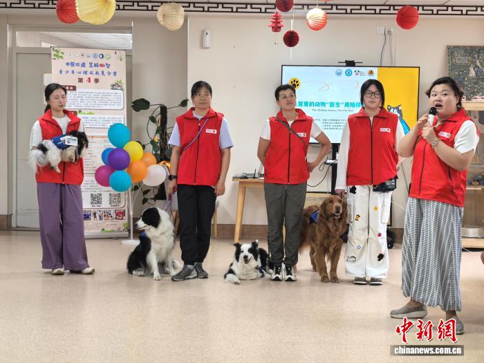 中新网上海7月30日电 (记者 陈静)在同济大学附属精神卫生中心中西医结合失眠诊疗中心,一群孩子与四条治疗犬相遇,撸一撸乖巧的治疗犬,在与狗开心地游戏、互动中,孩子们的脸上绽放出开心的笑容。