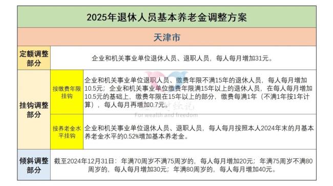 天津市的养老金调整方案中规中矩,定额调整部分为31元,缴费年限调整为每年0.7元,养老金比例挂钩为0.52%,高龄倾斜调整标准分别为20元、30元和40元。