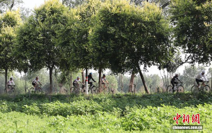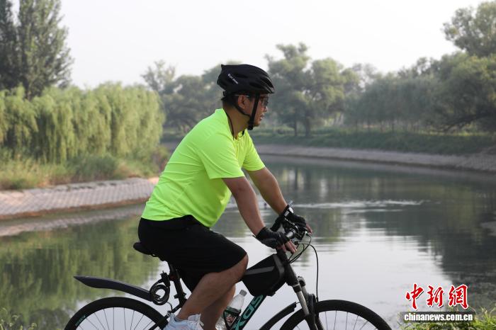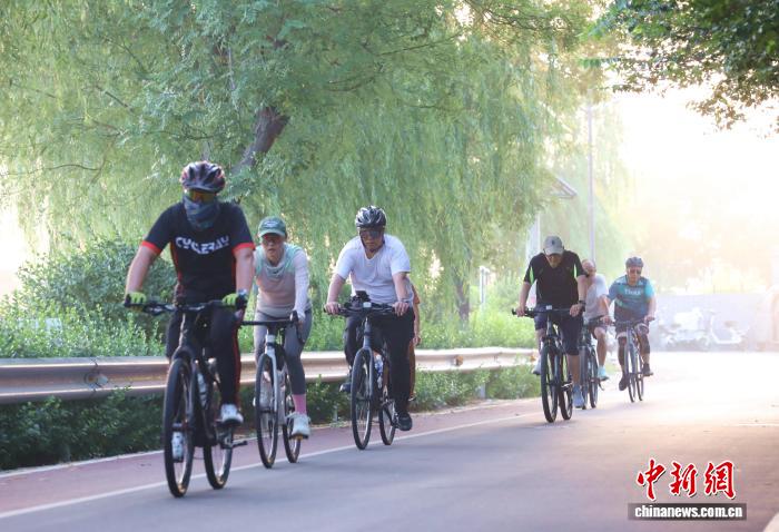 图为7月30日,市民在堤顶路上骑行。田博 摄
