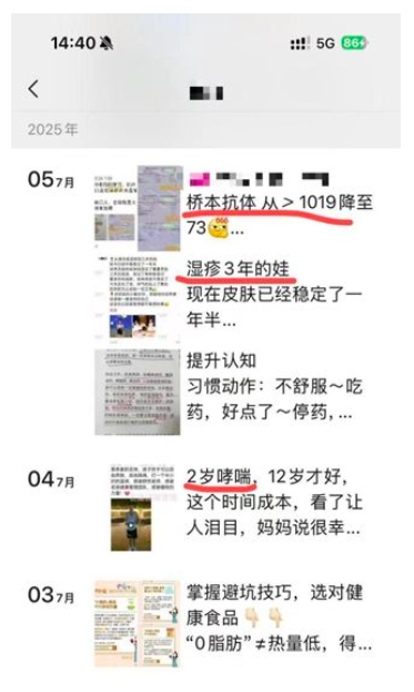 陈女士反映,该“营养师”小红书账号已经注销,但微信公众号和朋友圈仍不断更新,其中有大量服用保健品后的“健康奇迹”。记者调查发现,该“营养师”在各平台均未展示营养师资质证明。陈女士表示,她通过该“营养师”的个人介绍、营养健康讲座分享和健康群的案例,逐步相信其“营养师”专业能力。