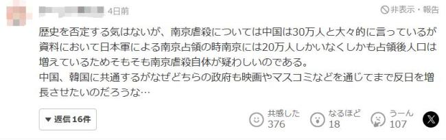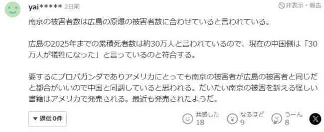 此外,部分评论还复述了所谓“进入南京的外国媒体没有亲眼目睹屠杀过程”以及“日军物资匮乏,无法进行大规模屠杀”的观点,进一步否认南京大屠杀的真实性。