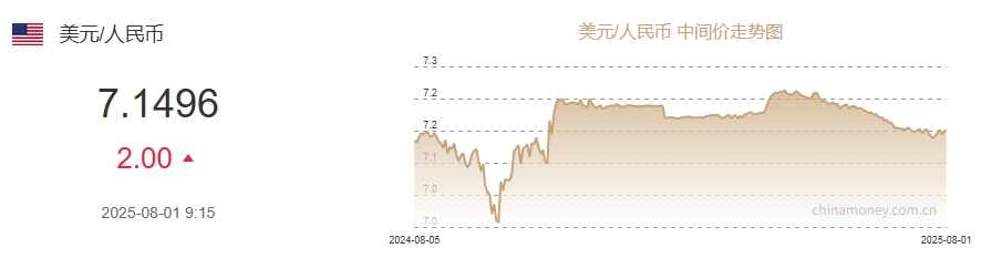中新网8月1日电 据中国外汇交易中心网站消息,中国人民银行授权中国外汇交易中心公布,2025年8月1日银行间外汇市场人民币汇率中间价为:1美元对人民币7.1496元,下调2个基点。图源:中国外汇交易中心网站截图
