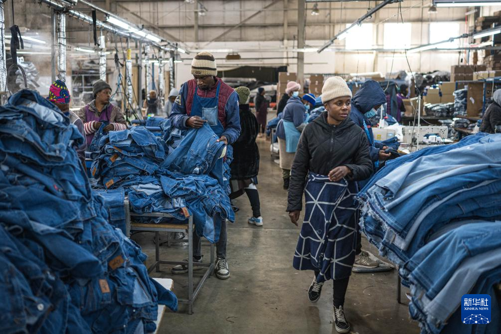 7月29日,工人在位于莱索托首都马塞卢的一家纺织工厂内整理牛仔裤。新华社记者 王冠森 摄