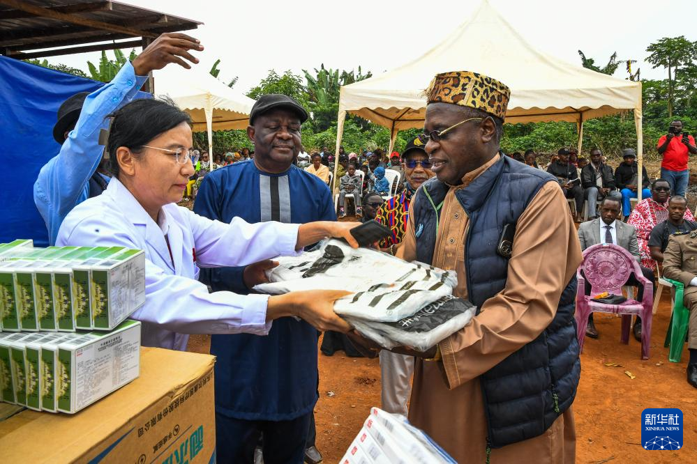 7月24日,在喀麦隆首都雅温得郊外的阿法诺亚村,中国援喀麦隆医疗队队员向当地人发放医疗物资。新华社发(科普索摄)