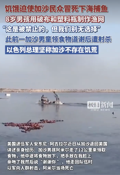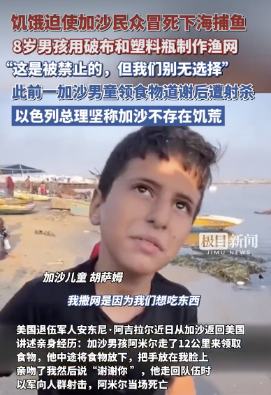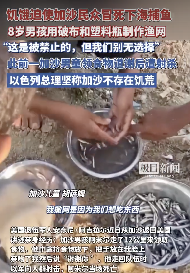 加沙8岁男孩冒死用塑料瓶捕鱼吃。饥饿迫使加沙民众冒死下海捕鱼,8岁男孩用破布和塑料瓶制作渔网,“这是被禁止的,但我们别无选择”。