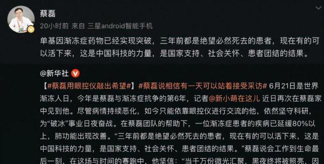 蔡磊被称为“电子发票第一人”,但2019年10月的一次体检将他的生活完全颠覆。渐冻症是一种绝症,通常患者只有三到五年的寿命。然而,蔡磊并没有放弃,而是倾尽全力投入到医学研究中。现在,他手脚几乎不能动弹,说话含糊不清,依靠眼球控制设备进行办公和交流,连吃东西和呼吸都变得困难。