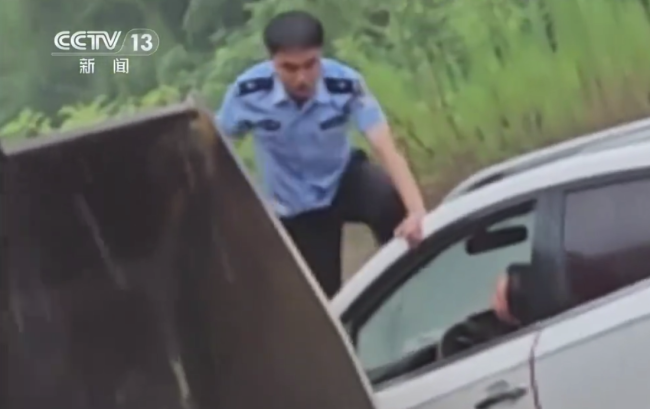 民警迅速联系了铲车,想办法接近女子。此时水流越发湍急,民警陈世杰登上铲车,随后跳到被困车辆的引擎盖上,通过车窗将女子拉出来并转移到铲车上,女子安全得救。