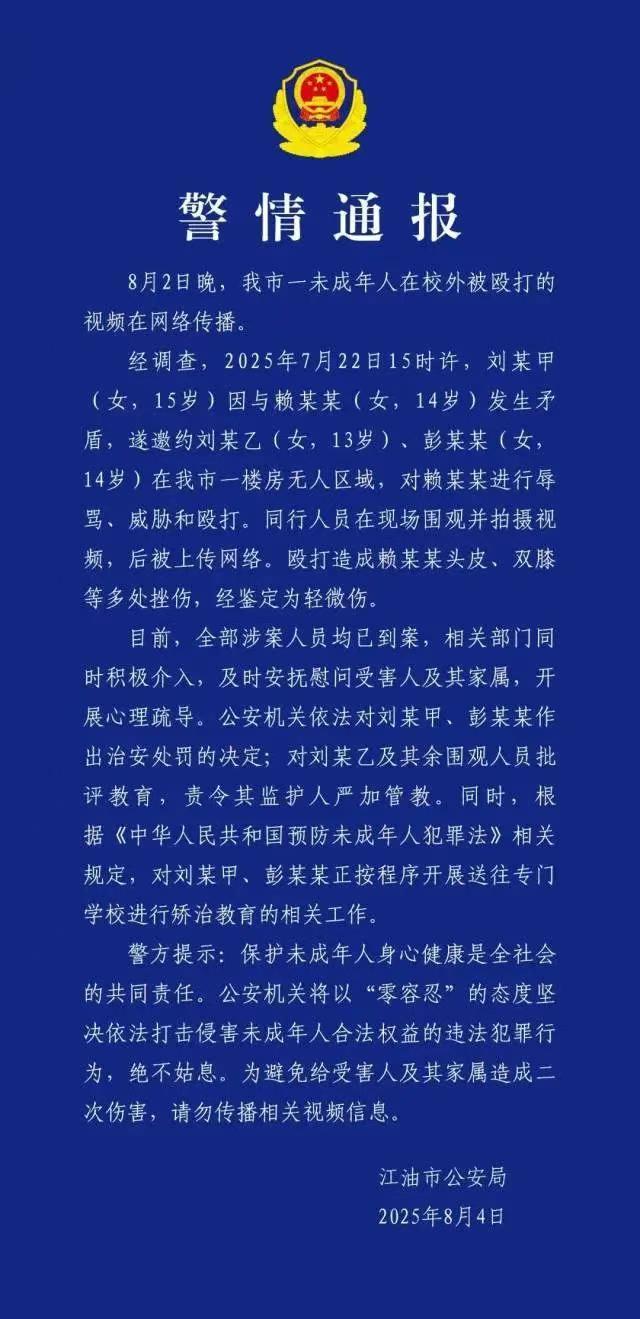 8月4日,四川省江油市公安局发布警情通报。8月2日晚,当地一名未成年人在校外被殴打的视频在网络上流传。经调查,事件发生在2025年7月22日15时左右,刘某甲(女,15岁)因与赖某某(女,14岁)产生矛盾,遂邀约刘某乙(女,13岁)和彭某某(女,14岁),在市内一处无人区域对赖某某进行辱骂、威胁和殴打。现场有同行人员围观并拍摄视频,随后该视频被上传至网络。殴打造成赖某某头皮、双膝等多处挫伤,经鉴定为轻微伤。