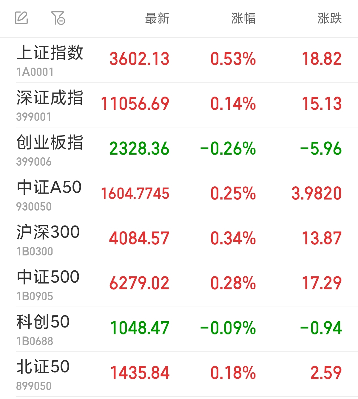 中新经纬8月5日电 周二早盘,A股三大指数高开后走势分化,上证指数再度站上3600点。截至午间收盘,上证指数涨0.53%,报3602.13点;深证成指涨0.14%,报11056.69点;创业板指跌0.26%,报2328.36点。