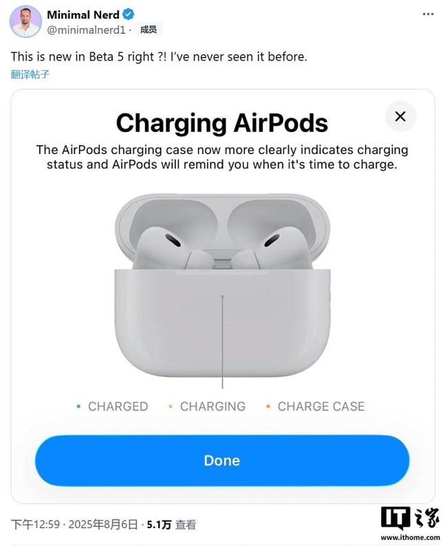 最新iOS 26 Beta 5更新为AirPods带来了三种不同的充电状态指示灯颜色。绿色代表已充满,黄色代表正在充电,橙色代表充电盒当前状态。然而,黄色和橙色之间的差异非常细微,用户可能难以区分。