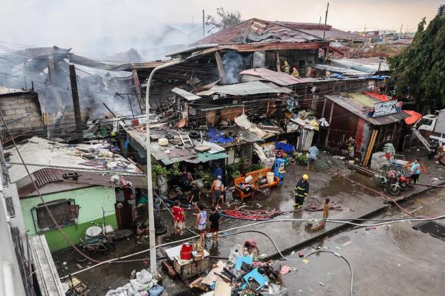 8月6日,菲律宾马尼拉一贫民窟发生大火,至少1500户家庭受到影响,3人受伤。大量消防车停在火灾现场附近,直升机也参与了灭火工作。居民和消防员共同努力扑灭大火,一些居民抢救出个人物品。火灾后,许多棚屋被烧毁,居民们查看受损情况。现场照片显示,消防员们在火场中积极工作,努力控制火势。