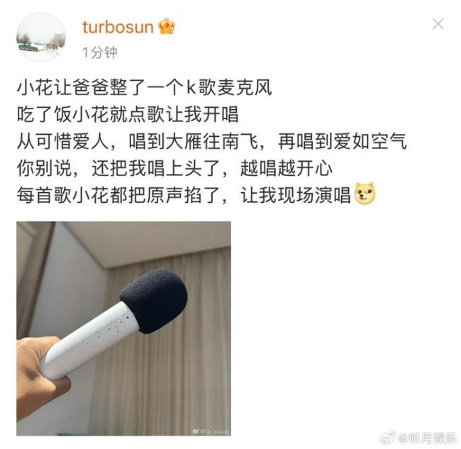 孙俪发文:小花让爸爸整了一个k歌麦克风,吃了饭小花就点歌让我开唱,从可惜爱人,唱到大雁往南飞,再唱到爱如空气,你别说,还把我唱上头了,越唱越开心,每首歌小花都把原声掐了,让我现场演唱。