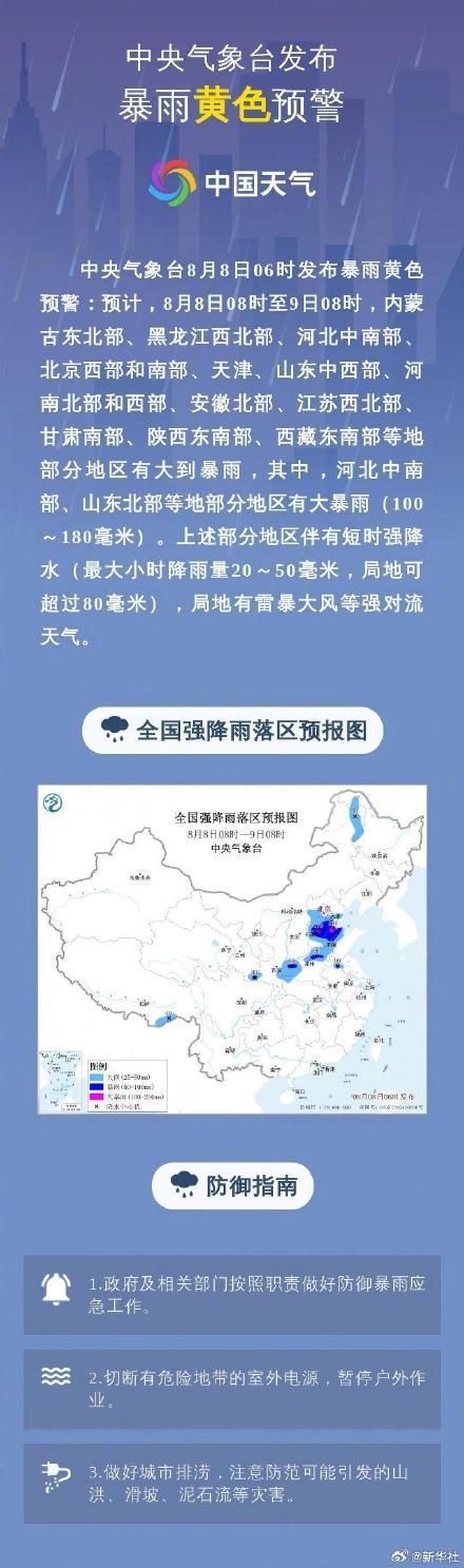 中央气象台8月8日6时发布暴雨黄色预警,预计8月8日8时至9日8时,内蒙古东北部、黑龙江西北部、河北中南部、北京西部和南部、天津、山东中西部、河南北部和西部、安徽北部、江苏西北部、甘肃南部、陕西东南部、西藏东南部等地将出现大到暴雨。其中,河北中南部、山东北部部分地区可能出现大暴雨,降雨量预计在100至180毫米之间。这些地区还将伴有短时强降水,最大小时降雨量可能达到20至50毫米,局部地区甚至超过80毫米。此外,局地还可能出现雷暴大风等强对流天气,请注意安全。