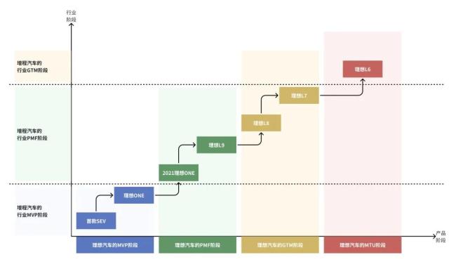 随后理想在增程领域的阶段超越了整个行业,在其他企业还在PMF阶段摸索(或者是对标理想进入到开发阶段)的时候,理想的后两款产品L8和L7就已经来到了市场。由于通过2021款理想ONE和理想L9对用户需求的验证,L8和L7可以毫无包袱的进入到GTM阶段,以领先行业的姿态,快速的收割市场。
