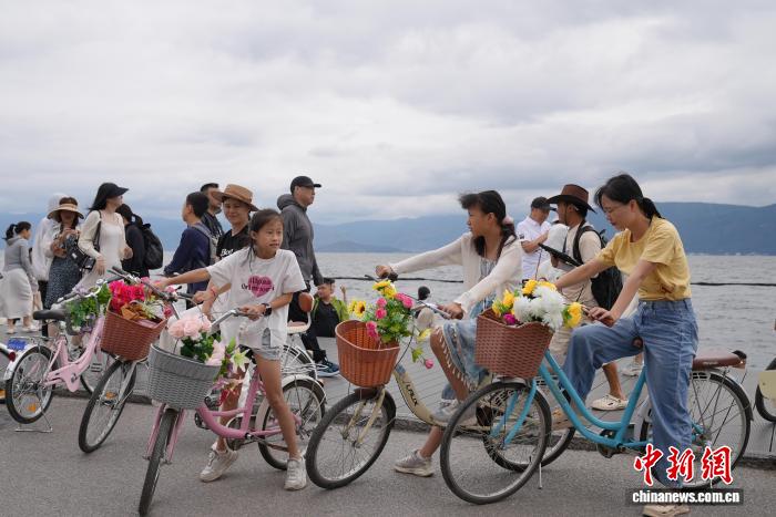 图为游人在大理市洱海生态廊道上骑行、拍照。白玲 摄