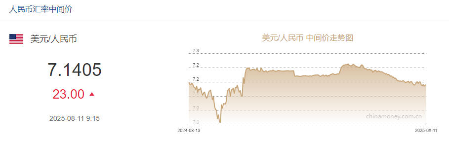 中新网8月11日电 据中国外汇交易中心网站消息,中国人民银行授权中国外汇交易中心公布,2025年8月11日银行间外汇市场人民币汇率中间价为:1美元对人民币7.1405元,下调23个基点。图源:中国外汇交易中心网站截图