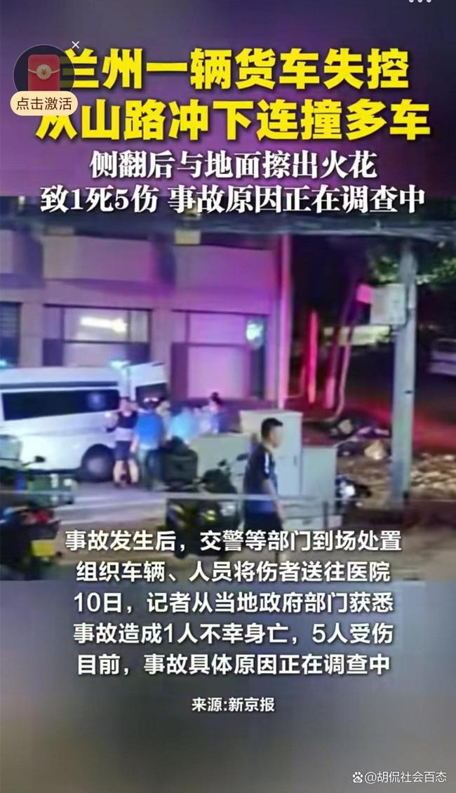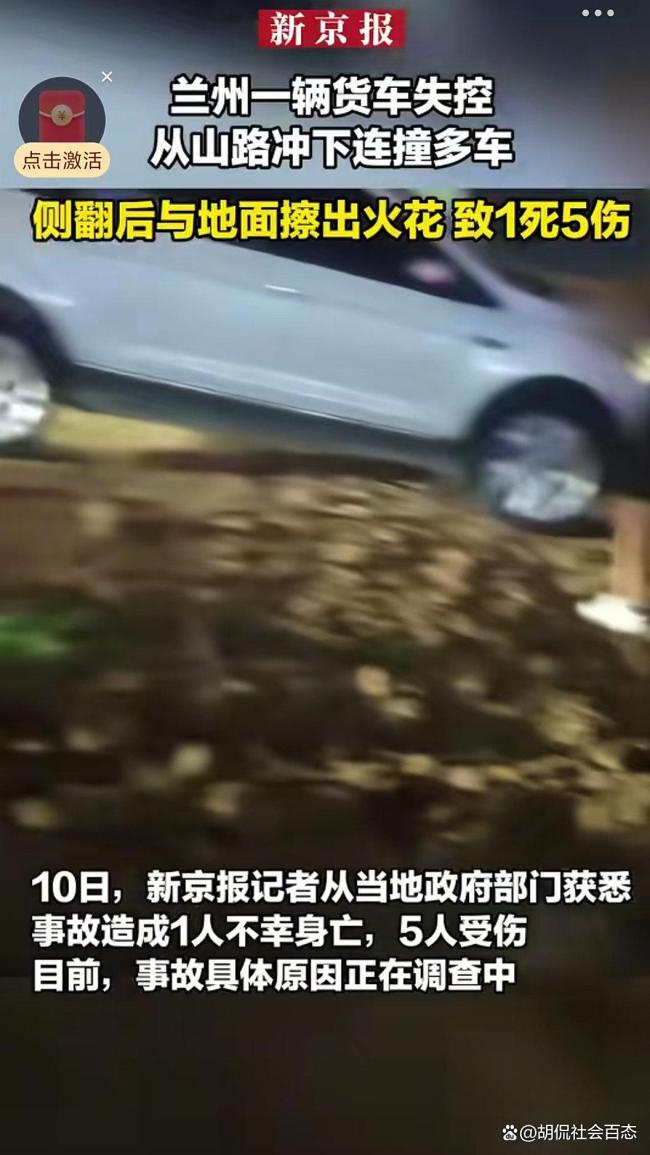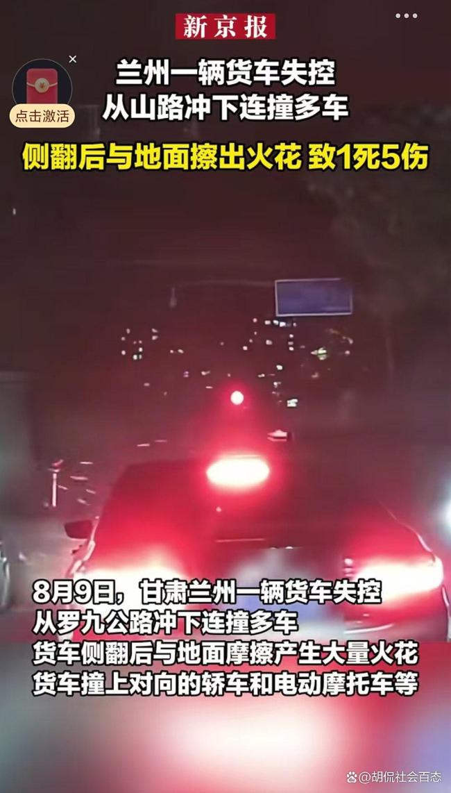 货车失控连撞多车致1死5伤 罗九公路通行规则引热议!8月9日,兰州罗九公路上发生了一起严重的交通事故。一辆货车在行驶中突然失控,沿着山路冲下,连续撞上多辆轿车和电动摩托车。撞击后,货车侧翻,车身与地面摩擦产生大量火花。事故发生后,交警等相关部门迅速到场,将伤者送往医院救治,并展开现场处置工作。