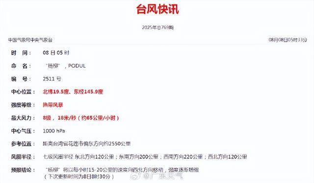 今年第11号台风“杨柳”于8月8日在西北太平洋洋面上生成。当天5点,其中心位于台湾省花莲市偏东方约2550公里的洋面上,北纬19.5度、东经145.9度,中心附近最大风力8级(18米/秒),中心最低气压1000百帕,七级风圈半径为120至220公里。