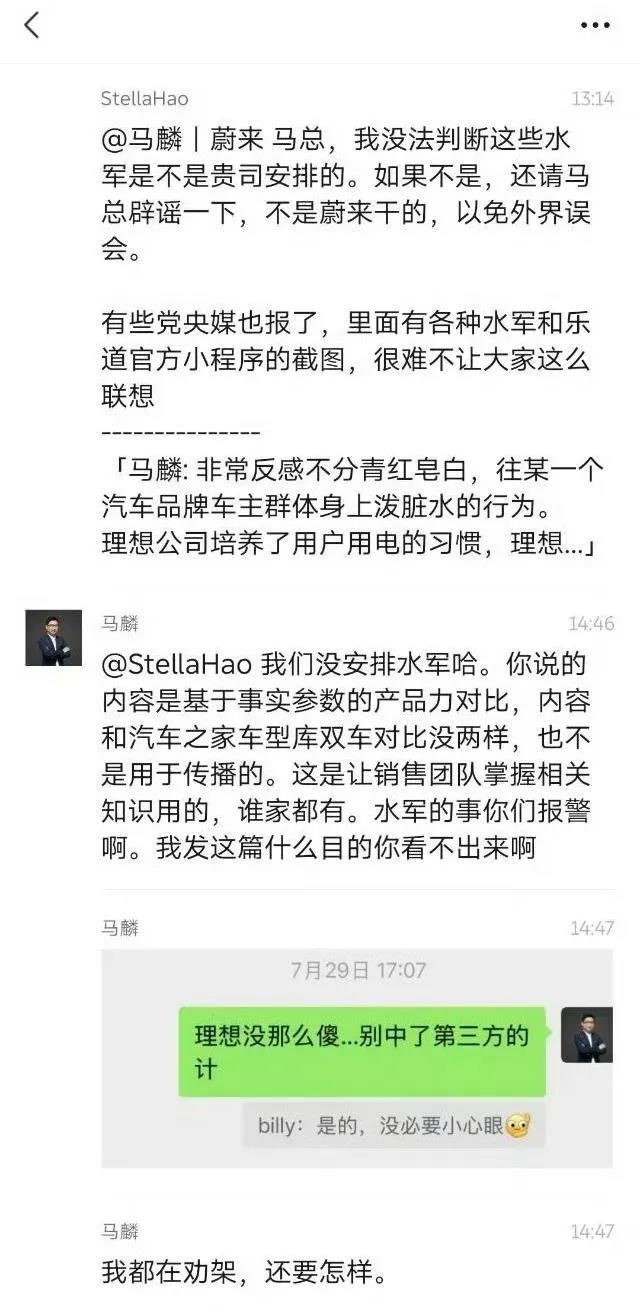 在马麟发了上述辟谣否认抹黑理想的微博后,蔚来和理想公关部高管在内部的微信群聊中还在继续“对线”。在某媒体群中,马麟在其中发布了上述辟谣的微博,而理想公关部王浩直接@马麟,表示:“我没法判断这些水军是不是贵司安排的。如果不是,还请马总辟谣一下,不是蔚来干的,以免外界误会。有些党央媒也报了,里面有各种水军和乐道官方小程序的截图很难不让大家这么联想。”
