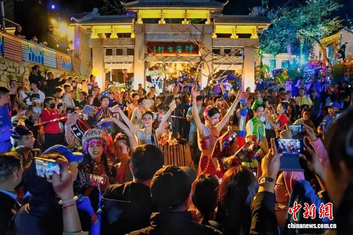 红叶柿岩旅游区夜间特色表演活动吸引游客打卡拍照。景区供图