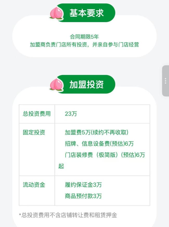 百果园开店之初就定位高端,门店主要以加盟形式运营。目前,百果园90%以上的门店为加盟店,加盟费用约为23万元。加盟商的毛利率在30%左右,预计回本周期为两年左右。百果园的服务特色是“三无退货”,即退货时无需小票、无需实物、无需理由。然而,招股书显示,加盟商和区域代理在接收产品时承担风险,通常无法退货。