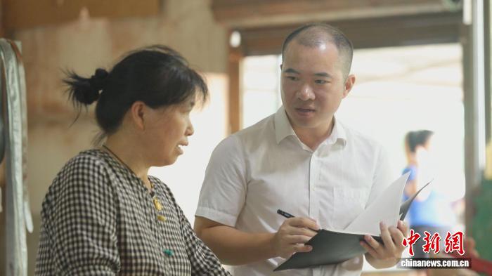 安仁产业开发区副主任谭志鹏走访记录伍金花工作情况和身体状况。安仁县委宣传部供图