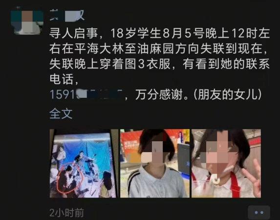 当天傍晚,女孩的父亲证实女儿已去世,并表示正在等待警方进一步调查。网上传播的信息中有多张寻人启事截图,其中一张显示失联女孩姓黄,18岁,于8月6日凌晨0时左右在平海大林至油麻园方向失联。家属后续确认准确失联时间为8月6日凌晨。