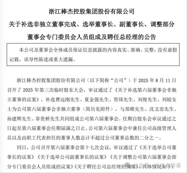 8月11日,随着新一届董事会名单公布,棒杰股份的会议室里悄然完成了一场权力交接。