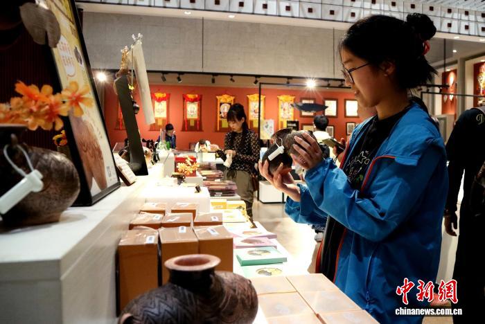 8月5日,游客在西藏博物馆文创店内挑选双体陶罐系列文创产品。旦增卓玛 摄