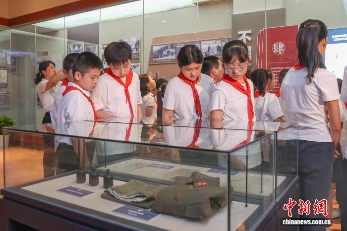 8月15日,江西南昌,一群学生在南昌新四军军部旧址陈列馆内参观。中新社记者 刘力鑫 摄