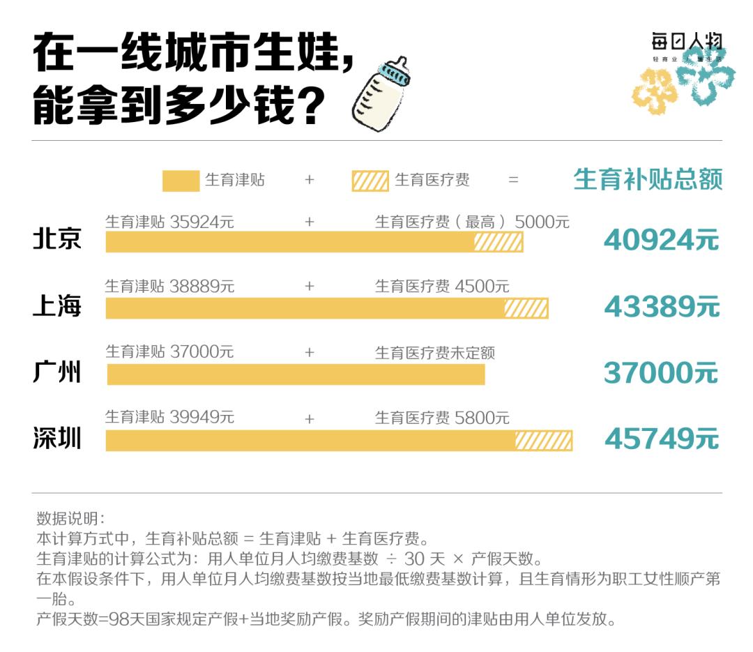 根据各城市社保最低缴费基数,每日人物计算了北京、上海、广州、深圳四个城市的女性职工能拿到的最低生育补贴金额。其中,深圳能拿到的最高,一个在深圳工作顺产第一胎的女性,至少能拿到4.5万元的生育补贴。
