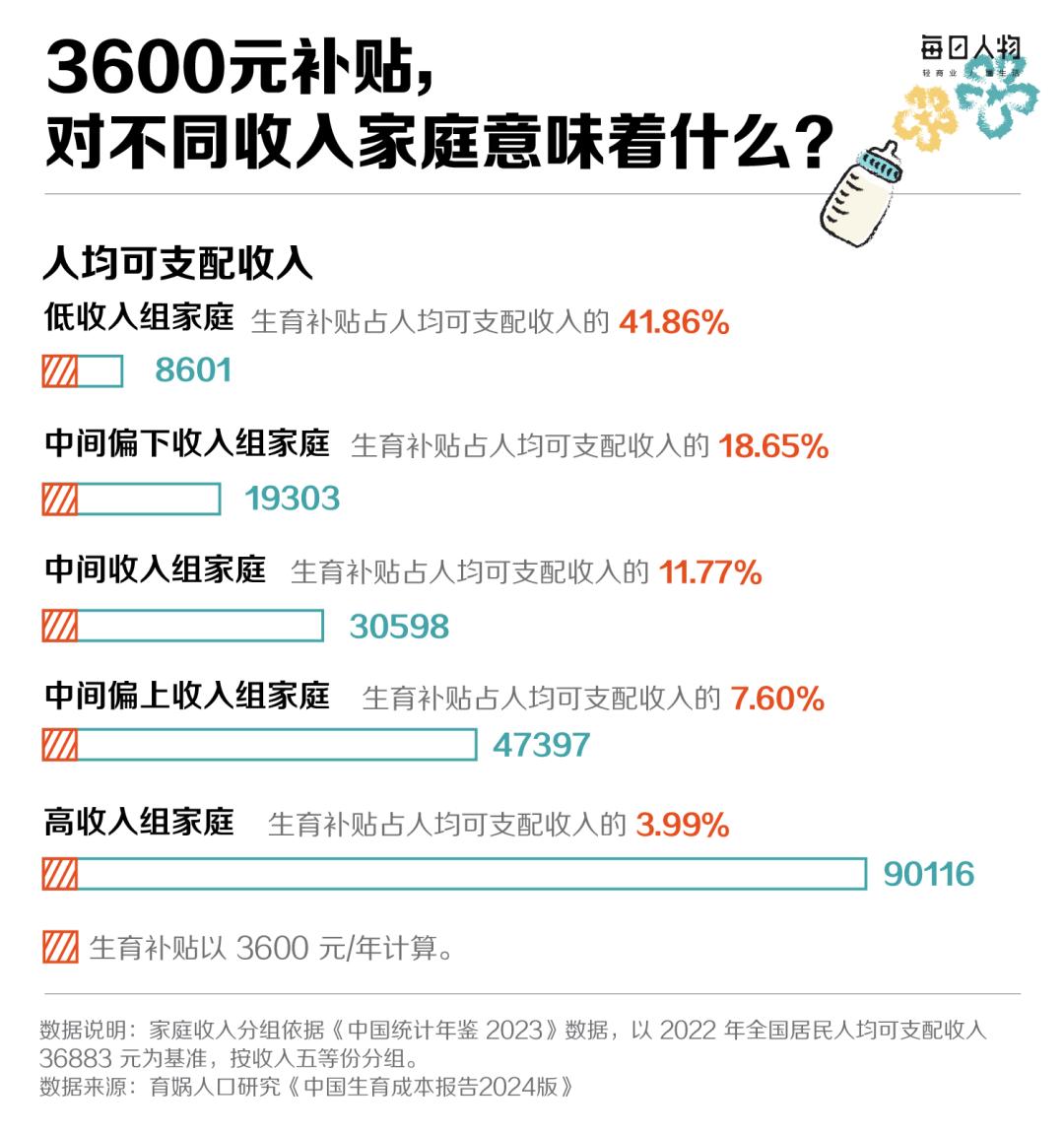 随着3600元生育补贴一同发酵的,是人们对于养娃成本的疑问——养一个孩子究竟要花多少钱,3600元又意味着什么?对于一线城市的中产家庭来说,养娃一年就要花掉十几万元,3600元只够请一个星期的月嫂,但对于低收入群体来说,3600元甚至占到了年平均可支配收入的一半。