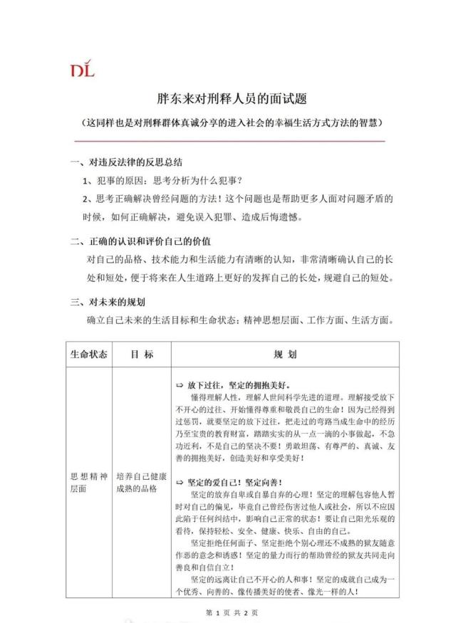 公布的面试题共有两页,内容涵盖对违反法律的反思总结、正确认识和评价自己的价值以及对未来的规划三大部分。题目要求刑释人员思考分析犯错的原因,并寻找正确解决问题的方法。于东来表示,这些问题旨在帮助人们面对问题时能够正确解决,避免误入犯罪造成遗憾。面试题下方还注明了这是对刑释群体真诚分享进入社会的幸福生活方式方法的智慧。