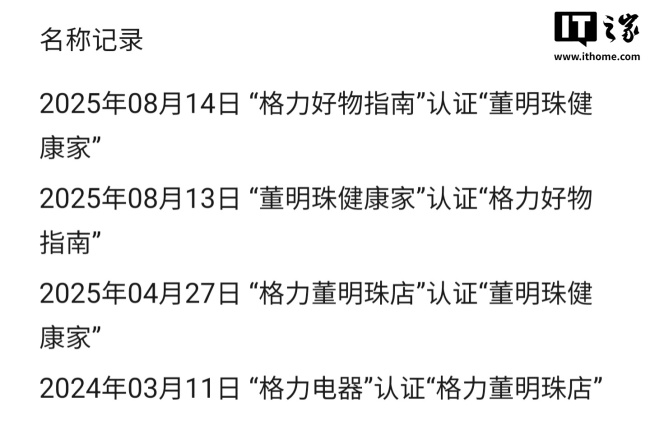 - 2025年8月14日,“格力好物指南”认证为“董明珠健康家” - 2025年8月13日,“董明珠健康家”认证为“格力好物指南” - 2025年4月27日,“格力董明珠店”认证为“董明珠健康家” - 2024年3月11日,“格力电器”认证为“格力董明珠店”