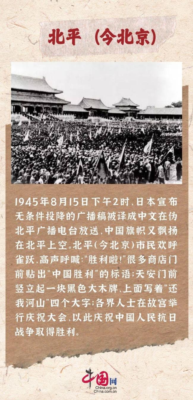 1945年8月15日,日本无条件投降,标志着中国人民14年艰苦抗战取得最终胜利。在这一天,全国各地人民以不同方式庆祝,规模空前,这些场景共同构成中华民族浴血重生、举国欢腾的胜利画卷。抗战精神——不畏强暴、血战到底的意志,成为中华民族宝贵的精神财富,至今仍激励着中国人民。80年后的今天,我们一同回顾历史上这一“胜利时刻”。