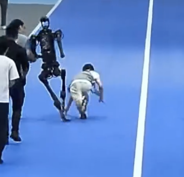 宇树机器人埋头猛冲撞翻友商操控员。宇树“黑皮体育生”赛场狂奔,埋头猛冲撞翻友商真人操控员。在2025世界人形机器人运动会现场,宇树科技一人形机器人在比赛时,不慎撞倒其他参赛机器人的操作者。撞完人后,该机器人继续狂奔比赛,引得全场哄堂大笑。